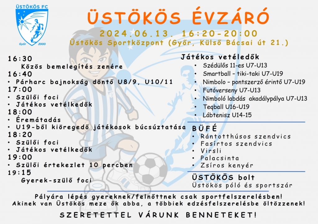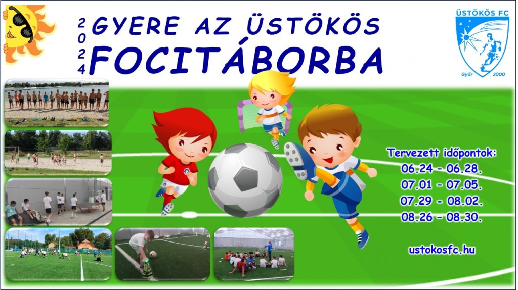 Tisztelt érdeklődők! Az idei nyáron is lehetőséget nyújtunk, hogy gyermekeitek sporttal, régi és új barátokkal töltsék a szünet egy részét. A megfelelő szakmai háttérről képzett szakembereink gondoskodnak. Közben folyamatosan figyelemmel követjük a Labdarúgó Európabajnokság és a Nyári Olimpiai Játékok eseményeit. A napi programban délelőtt és délután is szerepel labdarúgó foglalkozás. Opcionálisan lehet majd jelentkezni strandolós programra, ahol a fürdés mellet nem maradhat el a strandfoci sem. A résztvevők számára bőséges ebédet biztosítunk. Kedvezményes részvétel az Üstökös FC Győr és az Üstökös Körzetközpontba tartozó egyesületek játékosainak! Jelentkezési határidő: 1-2. tábor 2024.06.14. 3. tábor 2024.07.19. 4. tábor 2024.08.18. ONLINE JELENTKEZÉSILAP EGÉSZSÉGÜGYI NYILATKOZAT