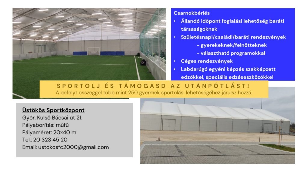 MŰFÜVES NAGYPÁLYA BÉRLÉSE ÜSTÖKÖS SPORTKÖZPONT (9029 Győr, Külső Bácsai út 21.) A pálya bérbevételére hétvégén, ill. hétköznap délelőtti és kora délutáni időszakban (8:00-16:00) van lehetőség edzés vagy mérkőzés céljából. Egyéni képzésre egyesületünk létesítményei nem bérelhetőek! Az Üstökös FC és az Üstökös FC Bácsa bajnoki mérkőzései a pályahasználat során elsőbbséget élveznek! Pályabérlés díja mérkőzésre: 50.000 Ft Pályabérlés díja mérkőzésre világítással: 70.000 Ft Pályabérlés óradíja: 30.000 Ft Pályabérlés óradíja világítással: 40.000 Ft Öltöző használat: 10.000 Ft/öltöző/alkalom Pályafoglalás véglegesítése: a mérkőzés napját megelőző hét péntekéig történő foglaló megfizetésével, melynek összege 20.000 Ft. Az ezt követő lemondás esetén a díjat csak abban az esetben áll módunkban visszatéríteni, amennyiben más csapat(ok) kihasználják a felszabaduló időpontot. Havazás esetén a pálya minőségének megóvása érdekében, a géppel okozott károsodás elkerülése végett nem garantált a hómentesítés. Havazás esetén ezért kérjük, érdeklődjenek telefonon a pálya használhatóságával kapcsolatban. A feltüntetett díjak nem áfakötelesek! Az aktuális pályafoglaltság ide kattintva nézhető meg: TÁBLÁZAT MEGNYITÁSA Öltözőhasználatra a létesítményben található fűthető konténerekben, ill. a Bácsa FC pályán (autóval 1 perc) van lehetőség. Öltöző használati szándékot kérjük előre jelezni! A létesítményben az EDZÉSEK ZÁRT KAPUSAK. MÉRKŐZÉS RENDEZÉS esetén a mérkőző csapatok együttesen, teljes felelősséget vállalnak a szurkolók viselkedése, ill. a létesítmény szabályzatának betartatásával kapcsolatban, ill. kérhetik a zárt kapus rendezést is. Kérjük, az autókkal, buszokkal a létesítmény belső parkolójában (térköves és murvás terület) parkoljanak! A létesítmény területén szotyola, tökmag, stb., fogyasztása, héjának elszórása, ill. egyéb szemetelés szigorúan tilos! Dohányozni a létesítmény teljes területén tilos! Minden, a sporttelepre belépő személy köteles a mellékelt szabályzatokat betartani (kattints rá). ÜSTÖKÖS SPORTKÖZPONT HÁZIREND MŰFÜVES PÁLYA HASZNÁLATA Pályafoglalás, egyéb információk: ustokosfc2000@gmail.com +36203234520